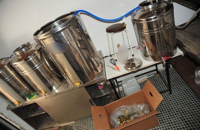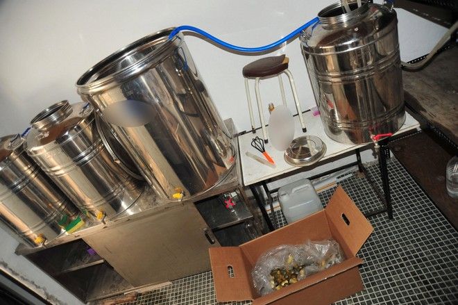 Μάλιστα το αρχηγικό μέλος της οργάνωσης, είχε εγκαταστήσει σε ειδικά διαμορφωμένο χώρο του σπιτιού του, παράνομο εργαστήριο για την παρασκευή και νόθευση των αλκοολούχων ποτών, στο οποίο βρέθηκε μεγάλη πλαστική δεξαμενή και μικρότερες ανοξείδωτες, σύστημα μετάγγισης με μοτέρ, μηχάνημα εμφιάλωσης, άδεια μπουκάλια, καπάκια, ετικέτες, ταινίες σφράγισης και ποσότητα οινοπνεύματος.