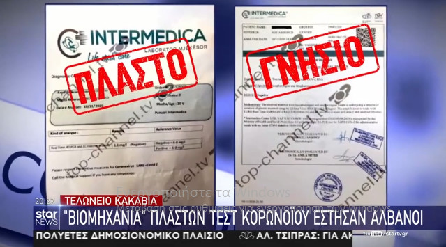 Εικόνες από ένα πλαστό και ένα γνήσιο τεστ για κορωνοϊό παρουσίασε το δελτίο ειδήσεων του Star. Οι διαφορές που προκύπτουν μεταξύ των δύο εγγράφων είναι το λογότυπο του διαγνωστικού κέντρου, η υπογραφή αλλά και η σφραγίδα του γιατρού που έχει πέσει θύμα πλαστογραφίας, όπως δηλώνει η ίδια στον ιδιωτικό σταθμό.