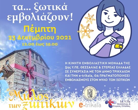 Με μια σημαντική απόφαση υπέρ της προστασίας της δημόσιας υγείας, ο Δήμος Τρικκαίων, η e-trikala ΑΕ και η 5η Υγειονομική Περιφέρεια Θεσσαλίας και Στ. Ελλάδας συνεργάζονται για εμβολιασμό έξω από τον Μύλο των Ξωτικών.