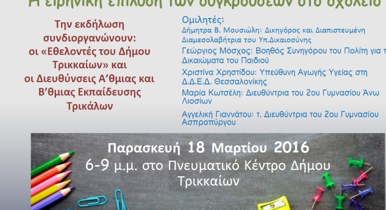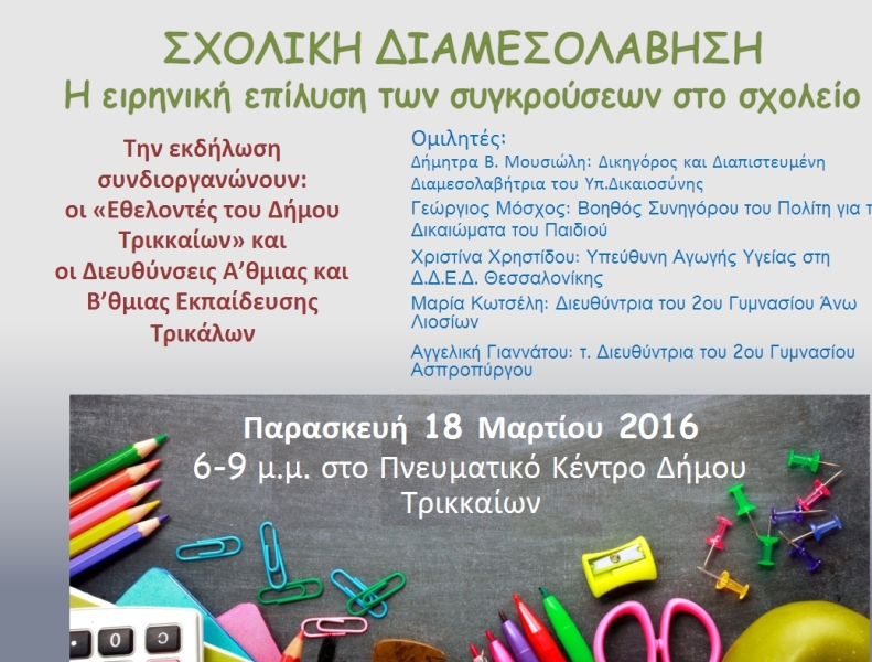 Ο Δήμος Τρικκαίων και η Ομάδα Εθελοντών, παρεμβαίνουν στα περιστατικά συγκρούσεων και βίας σε σχολικά περιβάλλοντα. Ανέλαβαν την πρωτοβουλία να παρουσιάσουν στους τρικαλινούς εκπαιδευτικούς, γονείς και μαθητές, μια ολοκληρωμένη πρόταση σύγχρονης αντιμετώπισης του φαινομένου. Ετσι, συνδιοργανώνουν, με τις Δ/νσεις Πρωτοβάθμιας και Δευτεροβάθμιας Εκπαίδευσης, εκπαιδευτική – ενημερωτική εκδήλωση για τη Σχολική Διαμεσολάβηση. Πρόκειται για διημερίδα, που θα πραγματοποιηθεί στις 18 και 19 Μαρτίου 2016, στο πνευματικό Κέντρο του Δήμου Τρικκαίων και στο 7ο Γυμνάσιο Τρικάλων, με βιωματικό τρόπο.