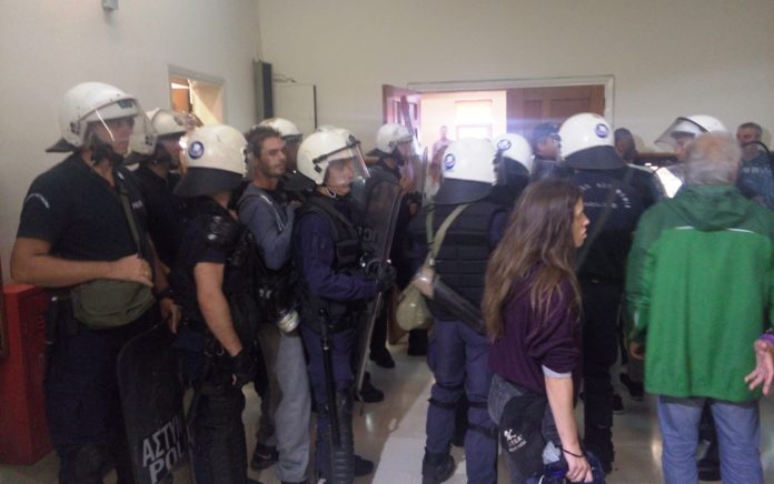 Ακολούθησε για αρκετά λεπτά της ώρας ένταση, ο Νίκος Κανελλής κλείστηκε στο γραφείο του προέδρου του Δημοτικού Συμβουλίου και έξω από την πόρτα περίμενε μια διμοιρία αστυνομικών, απέναντι από την οποία βρισκόταν πολίτες να φωνάζουν «Έξω η Αστυνομία από το Δημαρχείο» και κάποια στιγμή οι αστυνομικοί με τις ασπίδες να ανοίγουν τον κλοιό που είχε δημιουργηθεί από τους πολίτες.