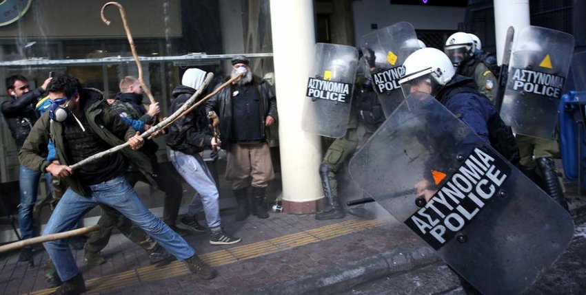 Αμέσως επιτέθηκαν κατά των δυνάμεων των ΜΑΤ, προκαλώντας φθορές με τις μαγκούρες τους στις κλούβες της αστυνομίας, που απάντησε με χημικά και κροτίδες. Στην συνέχεια ξέσπασε πετροπόλεμος και κυνηγητό, ενώ σε κάποιες περιπτώσεις ΜΑΤ και αγρότες ήρθαν στα χέρια.