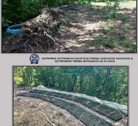 Στο πλαίσιο κατάλληλης αξιοποίησης πληροφορίας, αστυνομικοί του Αστυνομικού Τμήματος Μουζακίου μετέβησαν χθες (25-05-2022) το πρωί σε δασώδη και δυσπρόσιτη ημιορεινή περιοχή του Μουζακίου Καρδίτσας, όπου εντοπίστηκε ειδικά διαμορφωμένος χώρος, πρόσφορος για καλλιέργεια φυτών κάνναβης.