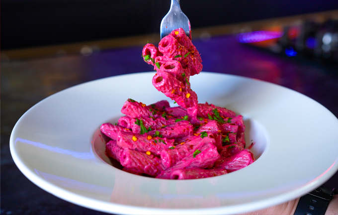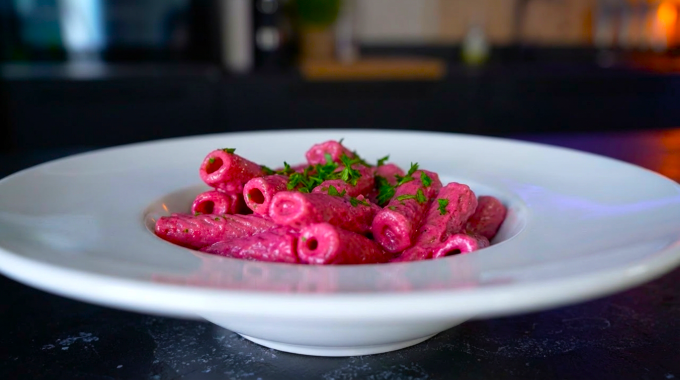 - Σε μπλέντερ ρίχνουμε τα ψημένα λαχανικά με τη Φέτα, τη πάπρικα, το νερό από τα ζυμαρικά και πολτοποιούμε πολύ καλά μέχρι να γίνει μια ωραία κρέμα.