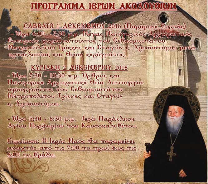 Φέρεται εις γνώσιν των ευλαβών Χριστιανών ότι την 2α Δεκεμβρίου 2018 Πανηγυρίζει μεγαλοπρεπώς το παρεκκλήσιο του Οσίου Πατρός ημών Πορφυρίου του Καυσοκαλυβίτου που βρίσκεται στο υπερώο του Ιερού Προσκυνηματικού Ναού Αγίου Βησσαρίωνος Τρικάλων.