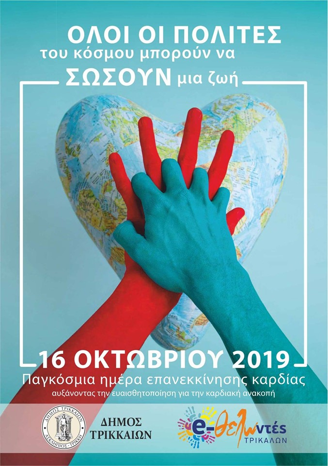 Για μια ακόμη χρονιά ο Δήμος Τρικκαίων συμμετέχει στην προσπάθεια για ενίσχυση των γνώσεων στην επανεκκίνηση καρδιάς. Μαζί με το Δίκτυο Εθελοντών Δήμου Τρικκαίων και σε συνεργασία με τα μέλη της Ελληνικής Εταιρείας Επείγουσας Προνοσοκομειακής Φροντίδας Θεσσαλίας, τον Σύλλογο Εκπαιδευτικών ΠΕ Τρικάλων και το εργαστήριο Πειραματικής Φυσιολογίας και Θεραπευτικής Ασκησης του ΤΕΦΑΑ του ΠΘ, διοργανώνουν εκδήλωση για την Παγκόσμια Ημέρα Επανεκκίνησης της Καρδιάς.