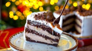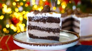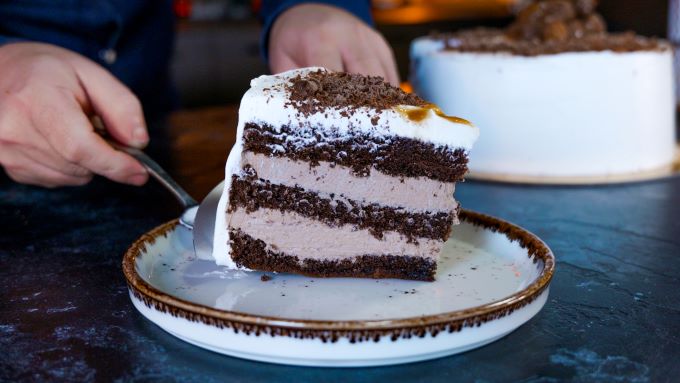 - Στήνουμε τη τούρτα βάζοντας τον πρώτο πάτο, σιροπιάζουμε και καλύπτουμε με τη μισή ποσότητα σοκολατένιας κρέμας
