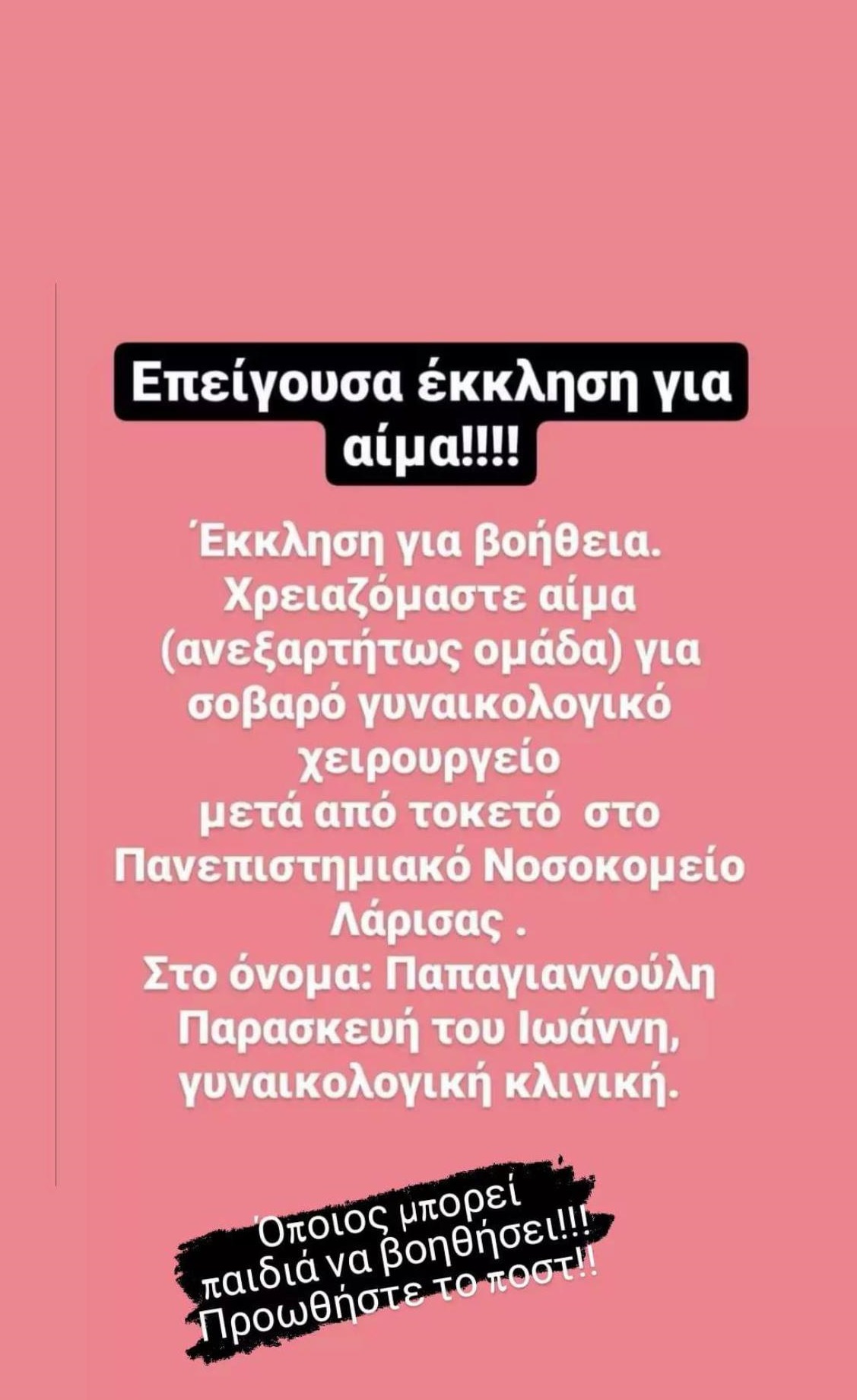 Συγκεκριμένα στην ανάρτηση αναφέρονται τα εξής: «Χρειαζόμαστε αίμα (ανεξαρτήτως ομάδα) για σοβαρό γυναικολογικό χειρουργείο μετά από τοκετό στο Πανεπιστημιακό Νοσοκομείο Λάρισας.
