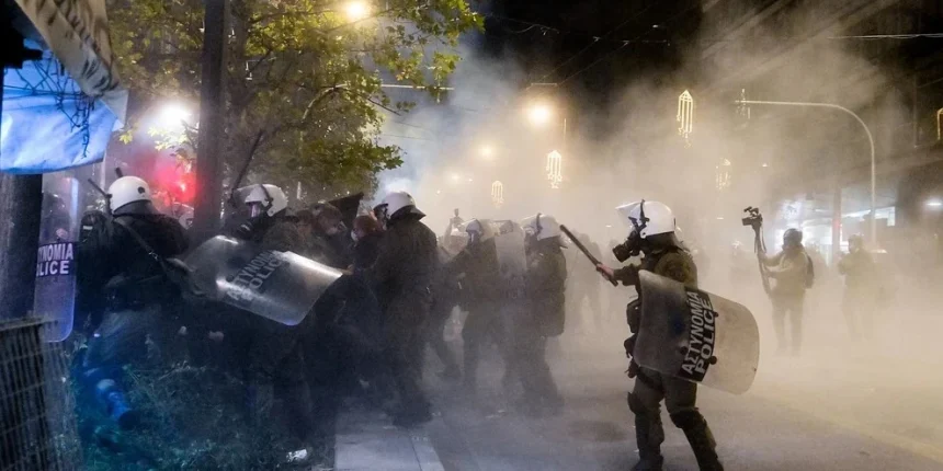 Σύμφωνα με την ΕΛΑΣ, περίπου στις 8 το βράδυ στη συμβολή των οδών Πανεπιστημίου και Εμμανουήλ Μπενάκη μια ομάδα περίπου 400 ατόμων που συμμετείχαν στην πορεία επιτέθηκαν σε διμοιρίες των ΜΑΤ, που απάντησαν κάνοντας χρήση χημικών.