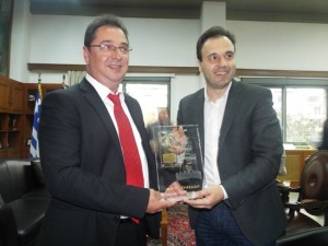 Εγινε επίσης ανταλλαγή δώρων, με τον κ. Παπαστεργίου να δωρίζει πλακέτα με ανάγλυφο το Βυζαντινό κάστρο και τον κ. Φαρούπο, ένα ομοίωμα κυκλαδίτικου ειδωλίου.