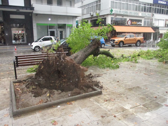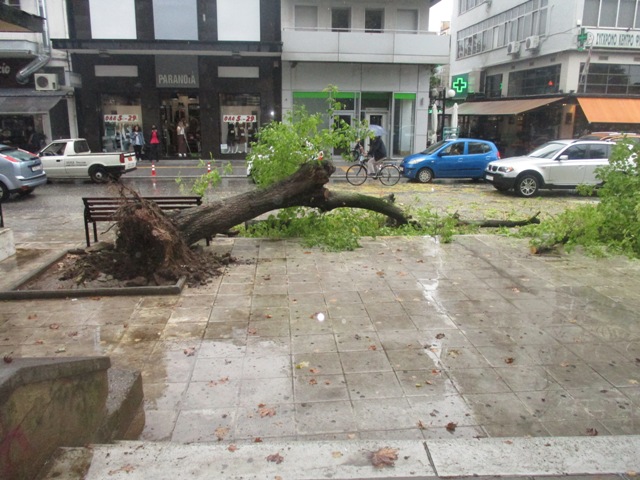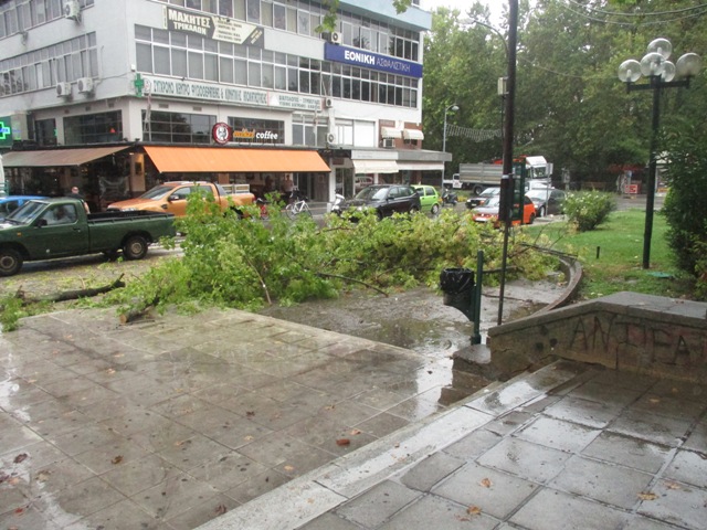 Ενα δέντρο στην κεντρική πλατεία των Τρικάλων, από την πλευρά που βρίσκεται το κιόσκι για την τουριστική ενημέρωση των επισκεπτών, ξεριζ’ωθηκε πριν από μισή ώρα περίπου, αλλά για καλή μας τύχη την ώρα που έπεσε δεν περνούσε κανένας περαστικός.