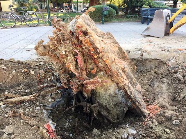 Η απόφαση επίσης όριζε ότι θα πρέπει να εξεταστεί το ενδεχόμενο, ορισμένα από τα δέντρα να διασωθούν. Από τη σημερινή εξέταση διαφάνηκε ότι τα προβλήματα είναι τεράστια στο ριζικό σύστημα των δέντρων, όπως φαίνεται από τις φωτογραφίες.