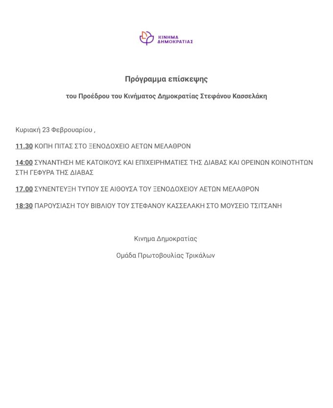 Την Π. Ε Τρικάλων θα επισκεφθεί την Κυριακή 22 Φεβρουαρίου ο πρόεδρος τυ Κινήματος Δημοκρατίας Στέφανος Κασσελάκης.