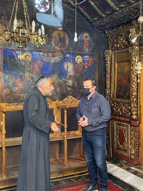 Κατά την επίσκεψή του εκεί, ο κ. Λιούτας, μαζί με τον Πρόεδρο της Κοινότητας, Δημήτρη Λάμπα, τον Ιερέα και τους επιτρόπους της εκκλησίας, είδε τη μεγάλη έκταση των ζημιών στον Ναό, ο οποίος χρονολογείται από το 1813.