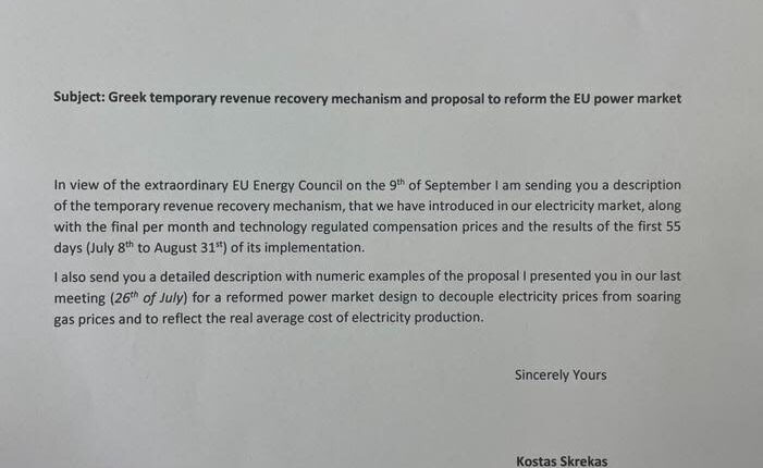 Επίσης, ο κ. Σκρέκας, στην επιστολή του, αναφέρθηκε, με συγκεκριμένα ποσοτικά παραδείγματα, στην πρόταση που παρουσίασε στο Συμβούλιο Υπουργών Ενέργειας στις 26 Ιουλίου, για έναν μόνιμο ευρωπαϊκό μηχανισμό που αποσυνδέει τις τιμές φυσικού αερίου από αυτές του ηλεκτρικού ρεύματος.