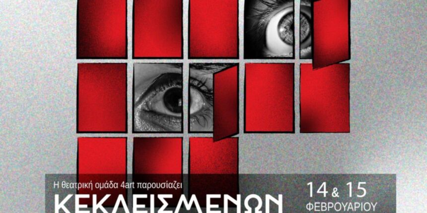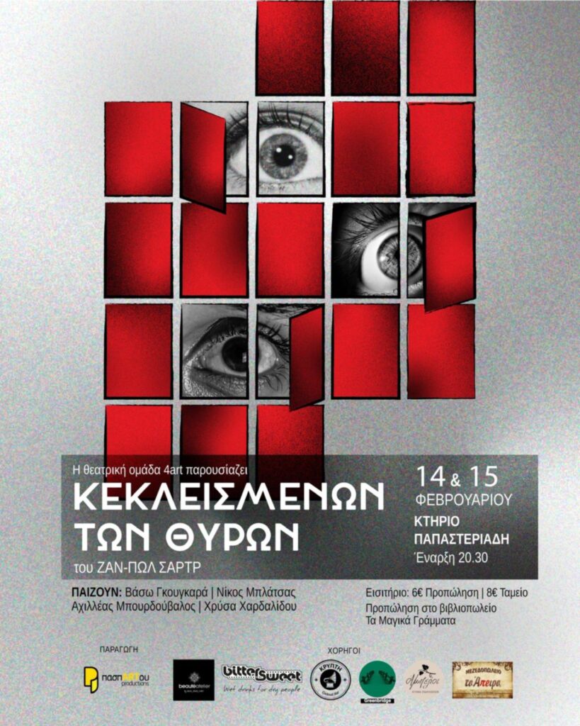 Επιστρέφει το « Κεκλεισμένων των Θυρών» από την ομάδα 4 ART , για δύο τελευταίες παραστάσεις. 3 άνθρωποι .Ένα δωμάτιο. Καμία έξοδος. Μετά την περσινή επιτυχία , η παράσταση « Κεκλεισμένων των Θυρών» , επιστρέφει για δύο τελευταίες παραστάσεις, δίνοντας στο κοινό την ευκαιρία να την παρακολουθήσει ξανά η για πρώτη φορά. Οι παραστάσεις θα πραγματοποιηθούν το Σάββατο 14 και Κυριακή 15 Φεβρουαρίου , στις 20.30μμ στο Κτίριο Παπαστεριάδη Στους ρόλους εμφανίζονται οι : Βάσω Γκουγκαρά , Νίκος Μπλάτσας, Αχιλλέας Μπουρδούβαλος και Χρύσα Χαρδαλίδου, σε μια παράσταση που ξεχώρισε για την ένταση , την ατμόσφαιρα και την θεατρική της δύναμη. Η επιστροφή της παράστασης έρχεται ως απάντηση στη θερμή ανταπόκριση του κοινού και τα ιδιαίτερα θετικά σχόλια που συνόδευσαν την πρώτη της παρουσίαση , ολοκληρώνοντας τον κύκλο της με δυο τελευταίες εμφανίσεις. Πληροφορίες παράστασης Χώρος : Kτίριο Παπαστεριάδη Ημερομηνίες: 14 & 15 Φεβρουαρίου Ωρα : 20.30ΜΜ Τιμές εισιτηρίων: Προπώληση : 6 ευρώ ( Βιβλιοπωλείο « Τα Μαγικά Γράμματα Καποδιστρίου 6) Ταμείο : 8 ευρώ