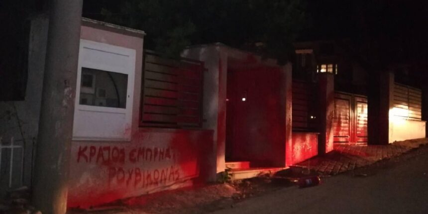 Τα μέλη της ομάδας «Ρουβίκωνας» έγραψαν συνθήματα με κόκκινη μπογιά στους εξωτερικούς τοίχους του σπιτιού και στη συνέχεια αποχώρησαν.
