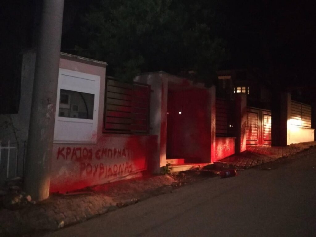 Τα μέλη της ομάδας «Ρουβίκωνας» έγραψαν συνθήματα με κόκκινη μπογιά στους εξωτερικούς τοίχους του σπιτιού και στη συνέχεια αποχώρησαν.