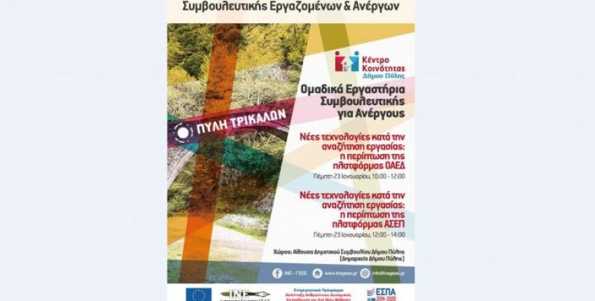 Το Κέντρο Κοινότητας Δήμου Πύλης σε συνεργασία με το Ινστιτούτο Εργασίας (ΙΝΕ) Γ.Σ.Ε.Ε. θα υλοποιήσει εργαστήριο πληροφόρησης και συμβουλευτικής για ανέργους στο Δήμο Πύλης.