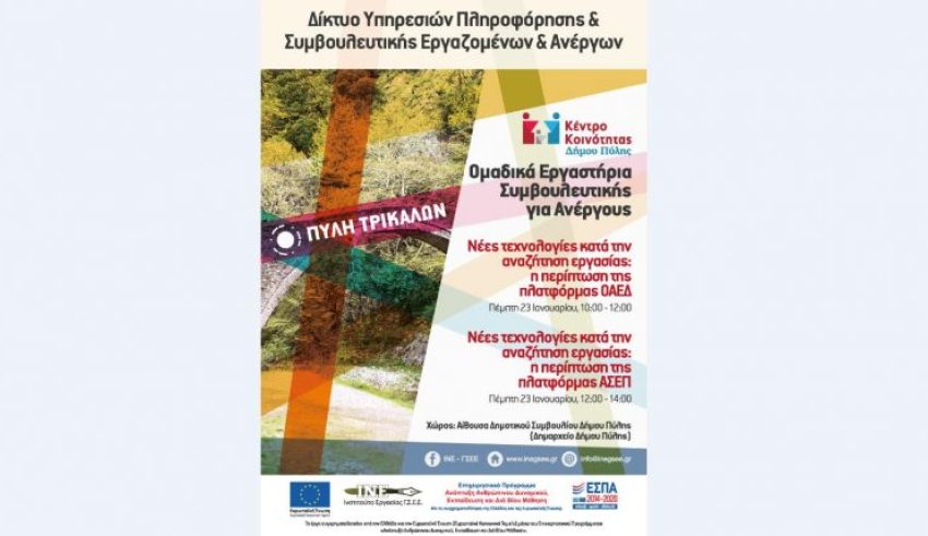 Το Κέντρο Κοινότητας Δήμου Πύλης σε συνεργασία με το Ινστιτούτο Εργασίας (ΙΝΕ) Γ.Σ.Ε.Ε. θα υλοποιήσει εργαστήριο πληροφόρησης και συμβουλευτικής για ανέργους στο Δήμο Πύλης.