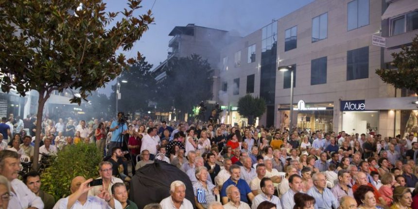 Πράγματι, ο πεζόδρομος της Ασκληπιού αποδείχθηκε πολύ στενός για να χωρέσει τους χιλιάδες συμπολίτες μας που με σημαίες, συνθήματα και… καπνογόνα δημιούργησαν προεκλογικό κλίμα άλλων εποχών.