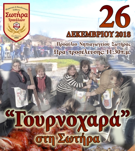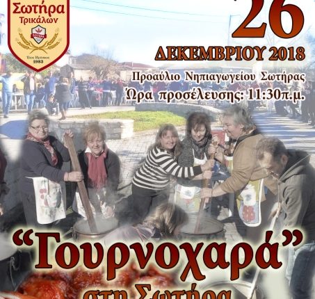 Ο Μορφωτικός & Εκπολιτιστικός Σύλλογος Σωτήρα Τρικάλων διοργανώνει την Τετάρτη 26 Δεκεμβρίου 2018 δεύτερη μέρα των Χριστουγέννων την καθιερωμένη εκδήλωση «Γουρνοχαρά». Η εκδήλωση θα πραγματοποιηθεί στο προαύλιο του Νηπιαγωγείου Σωτήρας με ώρα προσέλευσης του κοινού στις 11:30 π.μ. και είσοδο ελεύθερη. Μουσική χορός και τραγούδι για όλους, ενώ οι παρευρισκόμενοι θα έχουν τη δυνατότητα να γευθούν «τσιγαρίδες», πανσέτες και λουκάνικα. Θα εμφανιστούν τα χορευτικά τμήματα του Μ.Ε.Σ. Σωτήρα Τρικάλων και το παιδικό τμήμα του Μορφωτικού Συλλόγου Απανταχού Πλατανιωτών και ακολουθεί γλέντι για όλους.