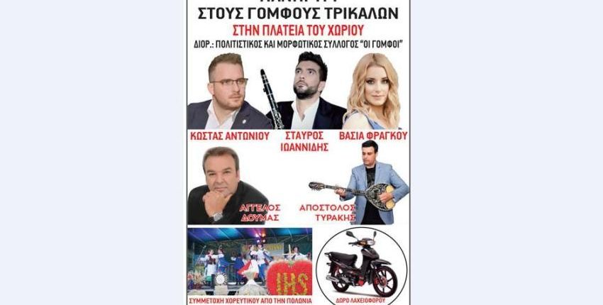 Την Παρασκευή 26 Ιουλίου στην πλατεία των Γόμφων σας Περιμένουμε όλους να διασκεδάσουμε σε μια λαϊκοδημοτική βραδιά, να θυμηθούμε την παράδοση, να γλεντήσουμε υπό τους ήχους του κλαρίνου του Σταύρου Ιωαννίδη και τις φωνές του ΚΩΣΤΑ ΑΝΤΩΝΙΟΥ της ΒΑΣΙΑΣ ΦΡΑΓΚΟΥ και του ΑΓΓΕΛΟΥ ΔΟΥΜΑ. Στο μπουζούκι ο ΑΠΟΣΤΟΛΗΣ ΤΥΡΑΚΗΣ.