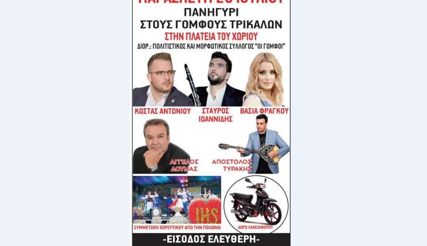 Ο Πολιτιστικός Σύλλογος Γόμφων πιστός στην Παράδοση και στην διάδοση και μεταφορά της στις νεότερες γενιές, οργανώνει ένα πανηγύρι παραδοσιακό με το χορευτικό του τμήμα υπό την διδασκαλία του Δημήτρη Δημουλά.