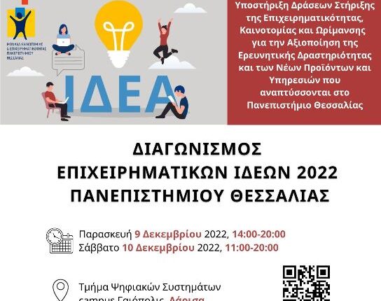 Η Μονάδα Καινοτομίας και Επιχειρηματικότητας (ΜΟΚΕ), του Πανεπιστημίου Θεσσαλίας σας προσκαλεί στον Διαγωνισμό Επιχειρηματικών Ιδεών 2022 που θα διεξαχθεί Παρασκευή 9 & Σάββατο 10 Δεκεμβρίου στην Λάρισα,