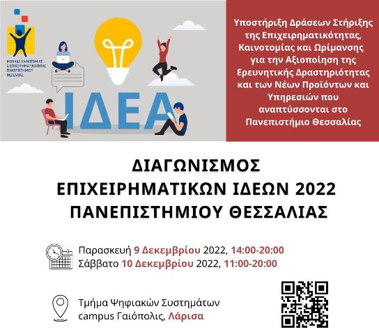 Η Μονάδα Καινοτομίας και Επιχειρηματικότητας (ΜΟΚΕ), του Πανεπιστημίου Θεσσαλίας σας προσκαλεί στον Διαγωνισμό Επιχειρηματικών Ιδεών 2022 που θα διεξαχθεί Παρασκευή 9 & Σάββατο 10 Δεκεμβρίου στην Λάρισα,