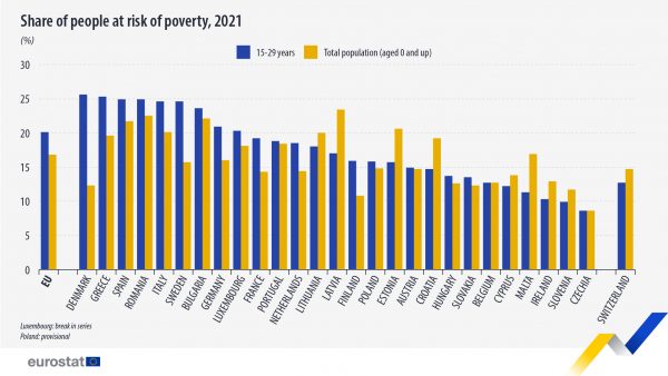 Στην ΕΕ, το μεγαλύτερο χάσμα μεταξύ των δύο παρατηρείται στη Δανία (12,3% του συνολικού πληθυσμού σε κίνδυνο φτώχειας έναντι 25,6% των νέων) και στη Σουηδία (15,7% έναντι 24,6%).