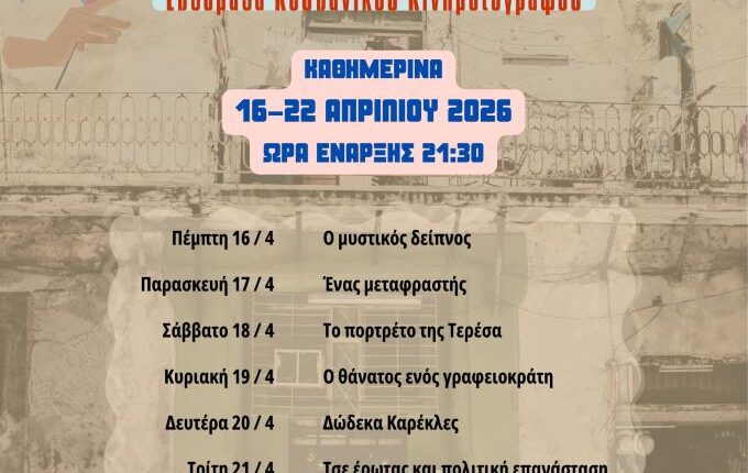 Οι ταινίες θα προβληθούν το διάστημα 16 έως 22 Απριλίου 2026, στην αίθουσα του