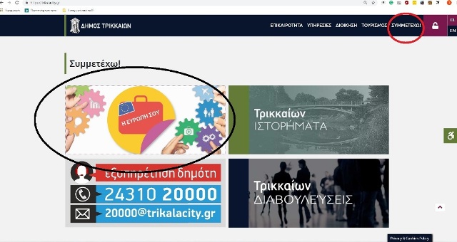 Μια νέα πληροφορική δράση για τους πολίτες πραγματοποίησε ο Δήμος Τρικκαίων. Πρόκειται για το banner «Η Ευρώπη σου», που αναρτήθηκε από την Πέμπτη 6 Φεβρουαρίου 2019 στην ιστοσελίδα του Δήμου, www.trikalacity.gr, στην ενότητα ΣΥΜΜΕΤΕΧΩ.