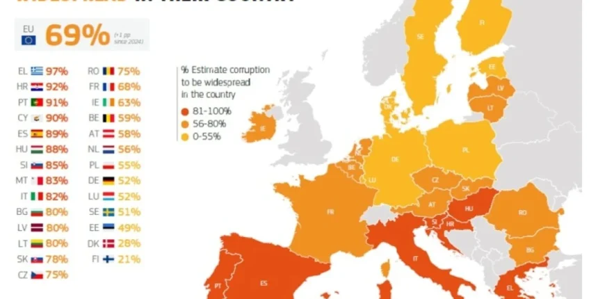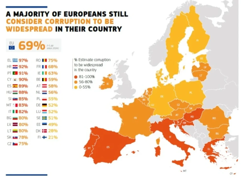 Σύμφωνα με το Ευρωβαρόμετρο, συνολικά το 69% των Ευρωπαίων πιστεύει ότι η διαφθορά έχει εξαπλωθεί στη χώρα τους, ενώ το 51% πιστεύει ότι η διαφθορά είναι ευρέως διαδεδομένη μεταξύ των πολιτικών κομμάτων.
