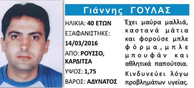 Ο 40χρονος Γιάννης Γούλας από το Ρούσσο Καρδίτσας έχει να δώσει σημάδια ζωής από τις 14 Μαρτίου, όταν εξαφανίστηκε κάτω από αδιευκρίνιστες συνθήκες.