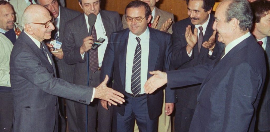 Μάλιστα στο πλαίσιο της παρουσίας του στην τελευταία έκανε και μία από τις δύο ομιλίες του που έμειναν στην ιστορία αφού απευθύνθηκε σε όλους μιλώντας μεν στα αγγλικά, αλλά χρησιμοποιώντας αποκλειστικά ελληνικές λέξεις, με μοναδικές εξαιρέσεις άρθρα συνδέσμους και αντωνυμίες! Ο πρώτος λόγος εκφωνήθηκε στο κλείσιμο της 12ης ετήσιας συνεδρίασης τον Οκτώβριο του 1957 στη Νέα Υόρκη, όπου παραβρέθηκε ως Διοικητής της Τράπεζας Ελλάδος, με τους παρευρισκόμενους να τον ακούν έκπληκτοι να λέει τα εξής: