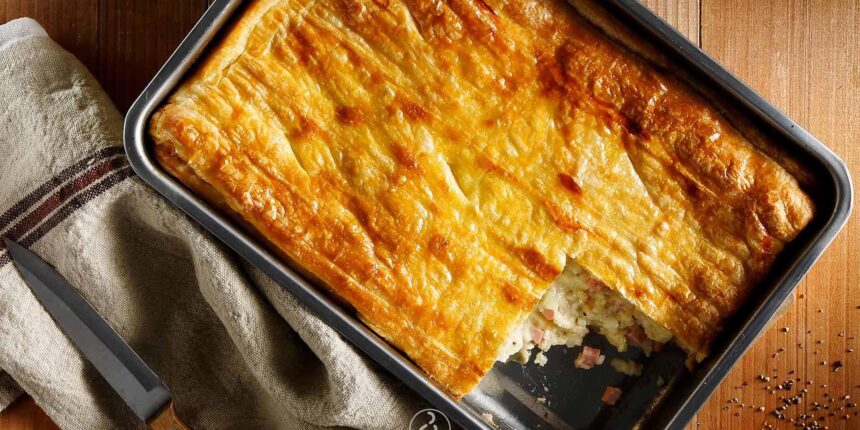 Χαράζουμε ελαφρά την σπιτική ζαμπονοτυρόπιτα της τεμπέλας με φύλλο κρούστας και χωρίς να την πιέζουμε, την κολλάμε προς τα κάτω.