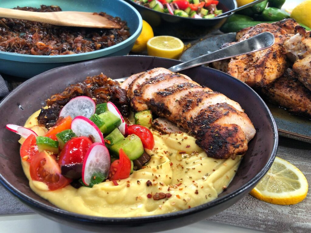 - Σε ένα βαθύ μπολ προσθέτουμε μια γενναιόδωρη δόση φάβας, στη συνέχεια κοτόπουλο, το οποίο τα έχουμε κόψει σε μικρά φιλετάκια, καραμελωμένα κρεμμύδια και τη γρήγορη σαλάτα συνοδευτικό.