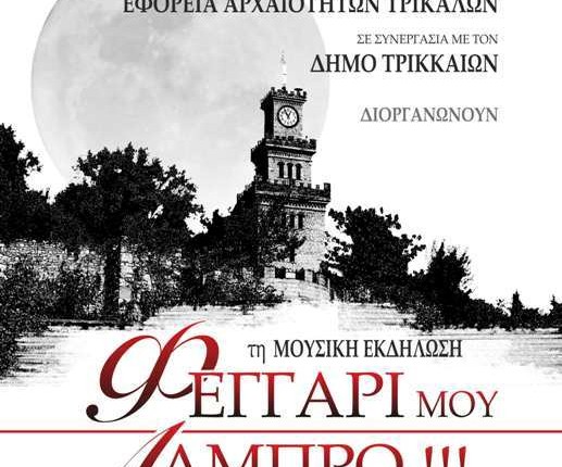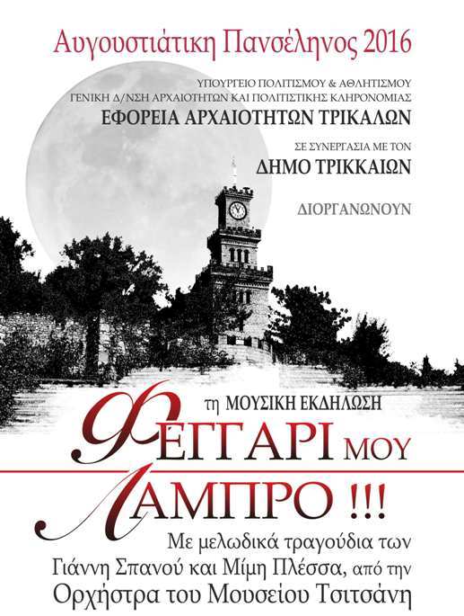 Το Υπουργείο Πολιτισμού & Αθλητισμού και η Εφορεία Αρχαιοτήτων Τρικάλων, για να γιορτάσουμε όλοι μαζί την Αυγουστιάτικη Πανσέληνο 2016, διοργανώνουν στο θέατρο του κάστρου της πόλεως των Τρικάλων, μουσική εκδήλωση με τίτλο: «Φεγγάρι μου Λαμπρό!!!», σε συνεργασία με το Δήμο Τρικκαίων, την Πέμπτη 18 Αυγούστου 2016 και ώρα 21:30 μ.μ.