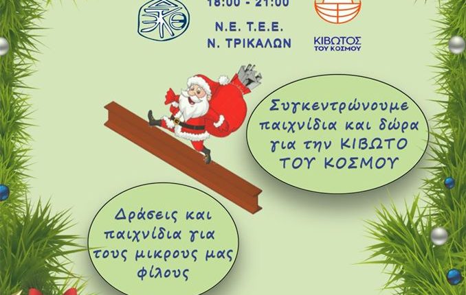 Την Παρασκευή 20 Δεκεμβρίου 2019 από τις 18:00 έως τις 21:00 στα γραφεία της Νομαρχιακής Επιτροπής Τ.Ε.Ε. Τρικάλων επί της οδού Καποδιστρίου 6 στον 1ο όροφο υποδεχόμαστε συναδέλφους και φίλους με τα παιδιά τους για να ανταλλάξουμε ευχές και να ενώσουμε τις δυνάμεις μας με την Κιβωτό του Κόσμου.