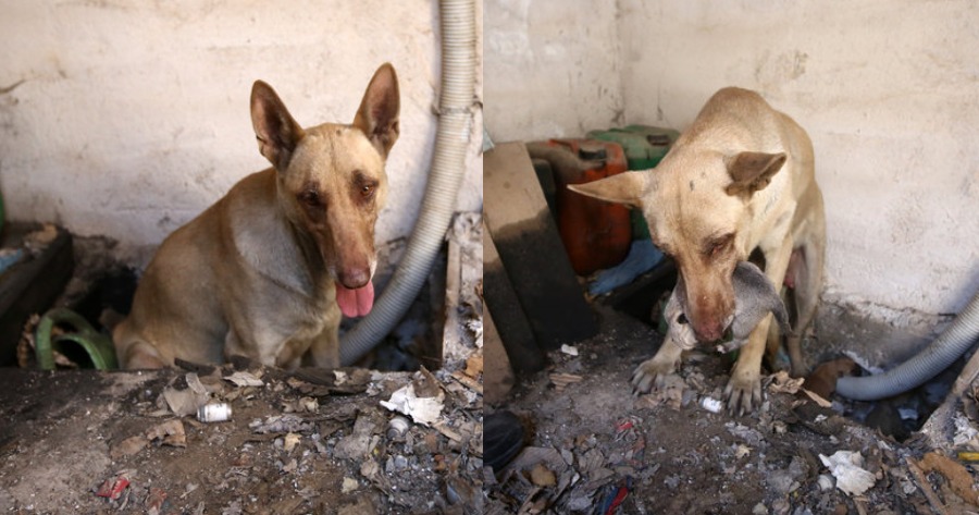 Μόλις την πλησίασαν έγινε κάτι μοναδικό. Η σκυλίτσα έσκυψε και έβγαλε από την τρύπα ένα ένα τα κουτάβια της, τα οποία τα είχε βάλει εκεί για να τα προστατεύσει.