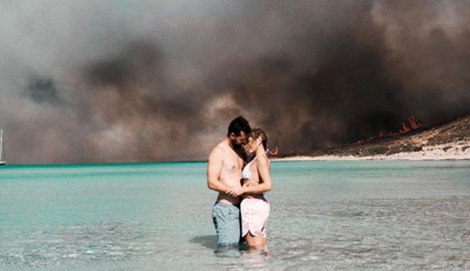 Στο καρέ βλέπουμε ένα ερωτευμένο ζευγάρι να ανταλλάζει ένα φιλί, ενώ βρίσκεται μέσα σε θάλασσα στην Ελαφόνησο. Στο background ο ουρανός είναι μαύρος από τη φωτιά και τη στάχτη.