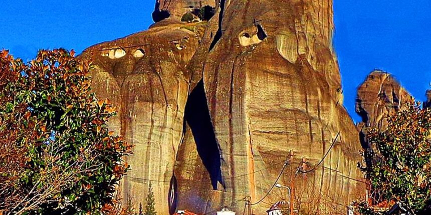 «Τα Μετέωρα είναι ένα σύμπλεγμα από τεράστιους, σκοτεινόχρωμους βράχους από ψαμμίτη οι οποίοι υψώνονται λίγο έξω από τη μικρή πόλη της Καλαμπάκας στη Θεσσαλία, στην Κεντρική Ελλάδα.