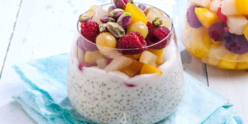 Γαρνίρουμε με φρεσκοκομμένα φρούτα σε διάφορα χρώματα και φιστίκι Αιγίνης.