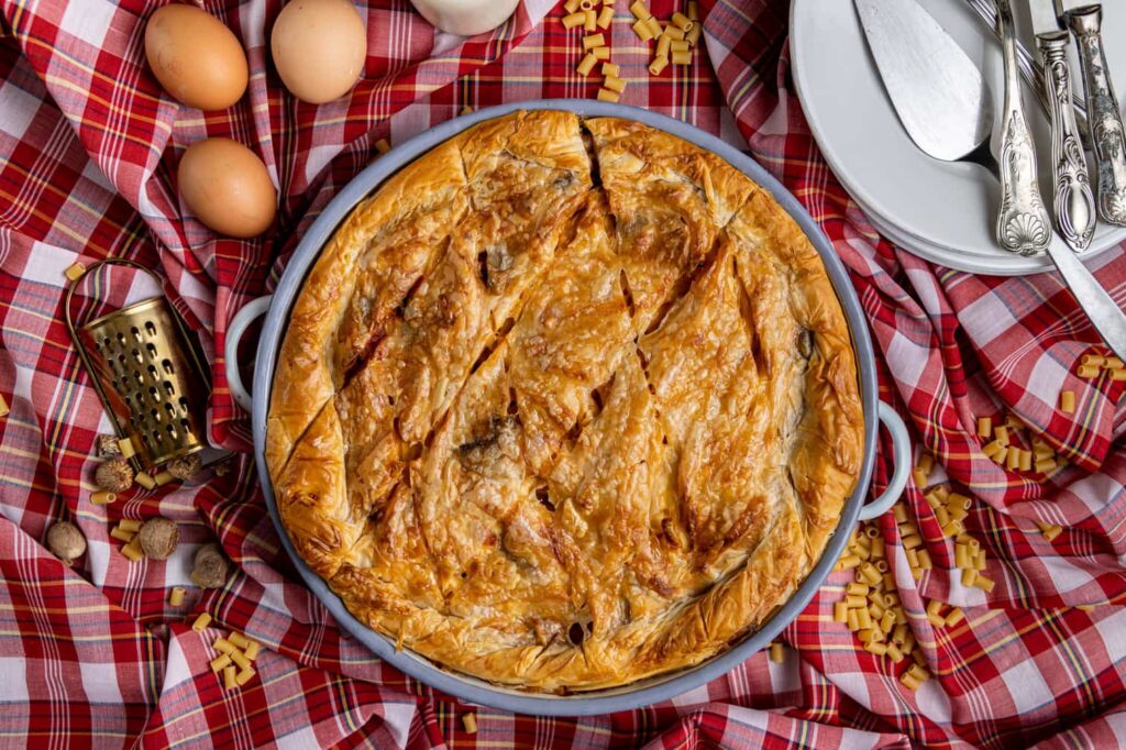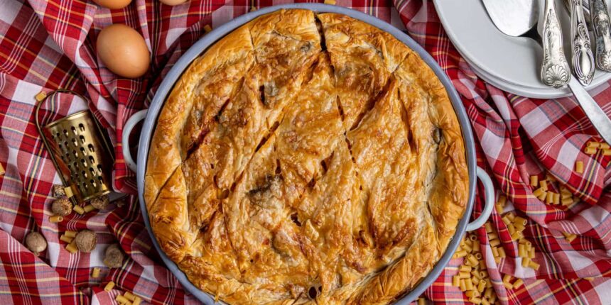 Ψήνουμε τη μακαρονόπιτα σε προθερμασμένο φούρνο στους 180°C στις αντιστάσεις για περίπου 1 ώρα μέχρι να ροδίσει καλά το φύλλο.