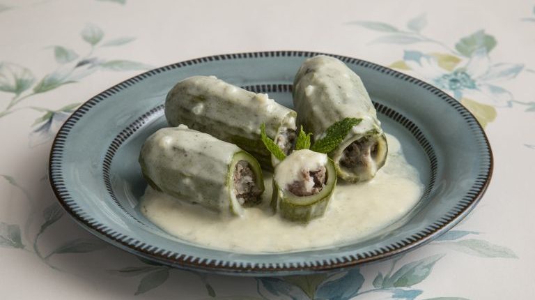 Πλένουμε τα κολοκυθάκια, κόβουμε τις άκρες τους και αφαιρούμε με προσοχή το εσωτερικό τους με ένα μικρό κουταλάκι του γλυκού (όπως κάνουμε για τα γεμιστά). Ρίχνουμε το μισό ελαιόλαδο σε μια κατσαρόλα και σοτάρουμε τα κρεμμύδια. Προσθέτουμε τον κιμά, ανακατεύουμε και μετά ρίχνουμε το ρύζι μαζί με το αλάτι, τον άνηθο, τον δυόσμο και το πιπέρι. Τα ανακατεύουμε λίγο πάνω στη φωτιά και τα αποσύρουμε. Αφήνουμε να κρυώσουν για τουλάχιστον 30 λεπτά.