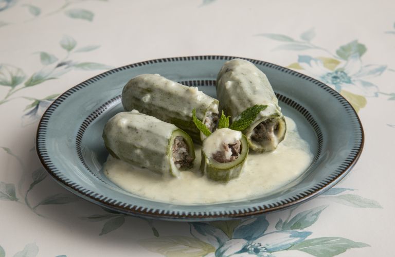 Πλένουμε τα κολοκυθάκια, κόβουμε τις άκρες τους και αφαιρούμε με προσοχή το εσωτερικό τους με ένα μικρό κουταλάκι του γλυκού (όπως κάνουμε για τα γεμιστά). Ρίχνουμε το μισό ελαιόλαδο σε μια κατσαρόλα και σοτάρουμε τα κρεμμύδια. Προσθέτουμε τον κιμά, ανακατεύουμε και μετά ρίχνουμε το ρύζι μαζί με το αλάτι, τον άνηθο, τον δυόσμο και το πιπέρι. Τα ανακατεύουμε λίγο πάνω στη φωτιά και τα αποσύρουμε. Αφήνουμε να κρυώσουν για τουλάχιστον 30 λεπτά.