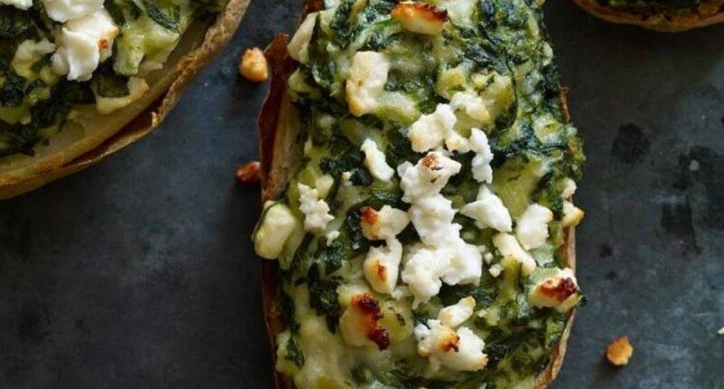 4. Ρίχνουμε, ανακατεύοντας το μείγμα σπανακιού και ½ φλιτζάνι φέτα. Γεμίζουμε κάθε πατάτα με περίπου τα ¾ της γέμισης. Καλύπτουμε την κάθε μία με 1 κουταλιά της σούπας από τη φέτα που μας έμεινε. Ψήνουμε μέχρι η φέτα να πάρει μια λίγο καφέ απόχρωση, για 25 με 35 λεπτά.