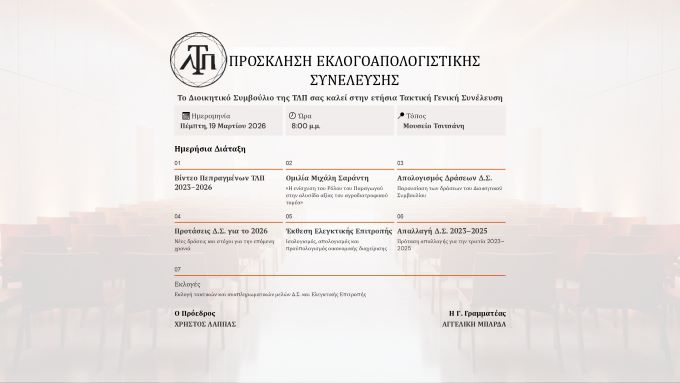 Η Συνέλευση θα πραγματοποιηθεί την Πέμπτη 19 Μαρτίου 2026 και ώρα 9:00 μμ στο Μουσείο Τσιτσάνη.