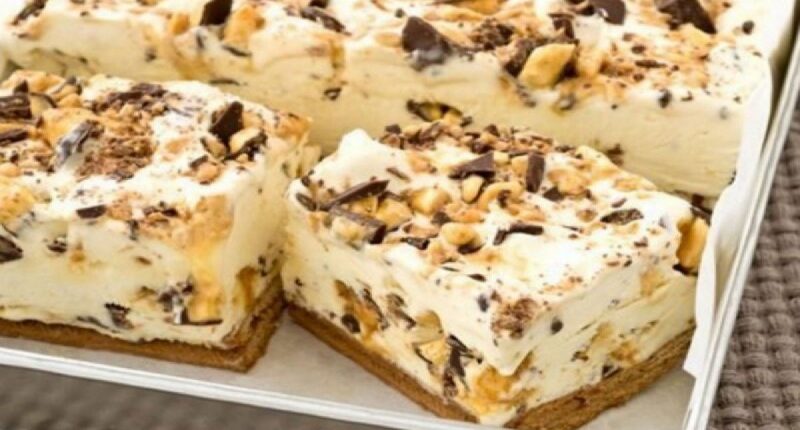 - Τα βάζετε στη κατάψυξη για ένα βράδυ, ή μέχρι να σταθεροποιηθεί και παγώσει καλά το μείγμα. Πριν σερβίρετε βγάζετε το γλυκό σας από τη κατάψυξη το αφήνετε για 10 λ σε θερμοκρασία δωματίου και μετά το κόβετε σε κομμάτια και σερβίρετε.